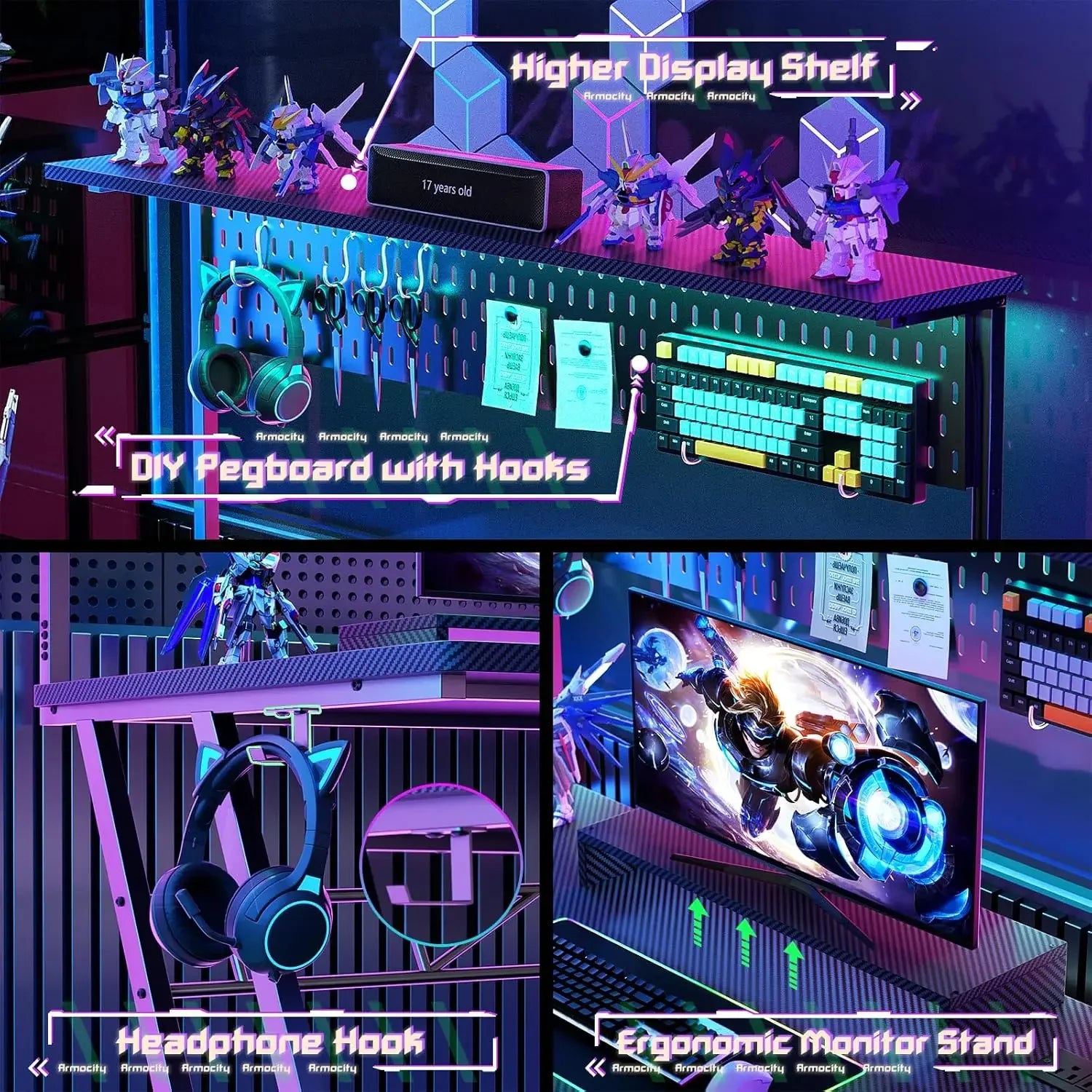 XMSJ Premium Ergonomic Gaming Desk Shelves Outlets Hutch LEDLuminanceDeluxeProPlusUltra